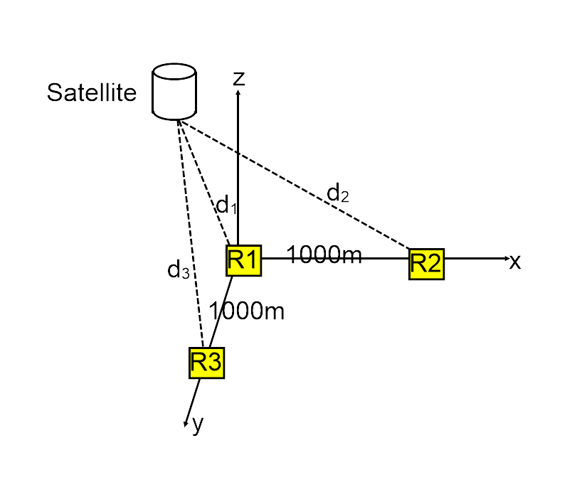 Use a radio technology to transmit and receive signals from the satellite. We will take the radio waves to be travelling at the speed of light 3 x 108 m/s. At R1, R2 and R3 in the diagram below there are radio transmitters/receivers which will be communicating with the satellite. Program a loop to record the times when signals are received and transmitted from R1, R2 and R3. The distances, d1, d2 and d3 can be calculate from receivers R1, R2 and R3 respectively using the formula for speed. The success of calculating will depend on the processing speeds and precision of the timers and other sensors;
